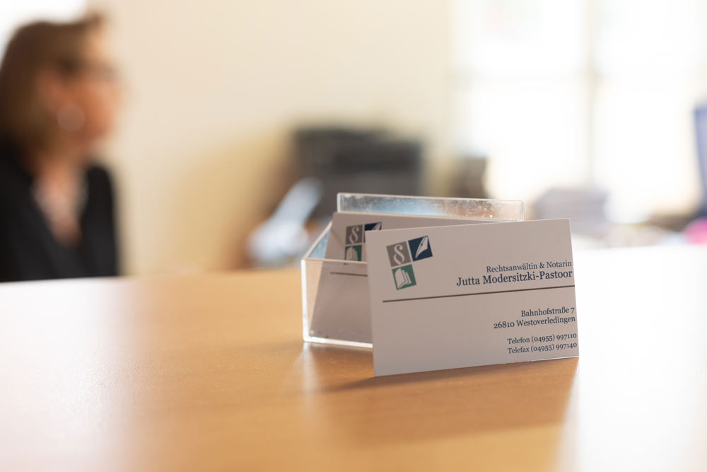 Ich begrüße Sie in der Kanzlei Modersitzki-Pastoor in Westoverledingen. Als Notarin übernehme ich klassische notarielle Angelegenheiten für Sie, z. B. Grundstückskaufverträge, Testamente, Handelsregisteranmeldungen, Gesellschaftsgründungen und -verträge, Erbscheine und mehr.